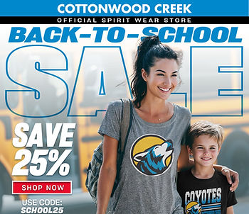 🎒 Back-to-School, Back in Style! 🐾Kick off the school year with Coyote Pride!Check out our Cottonwood Creek Spiritwear Sale – limited-time deals on tees, hoodies, and more. Whether you're a student, staff, or superfan parent, there's something for everyone to show off that Coyote spirit!✨ Don’t miss out — stock up while supplies last!Let’s make this school year our boldest (and comfiest) yet!